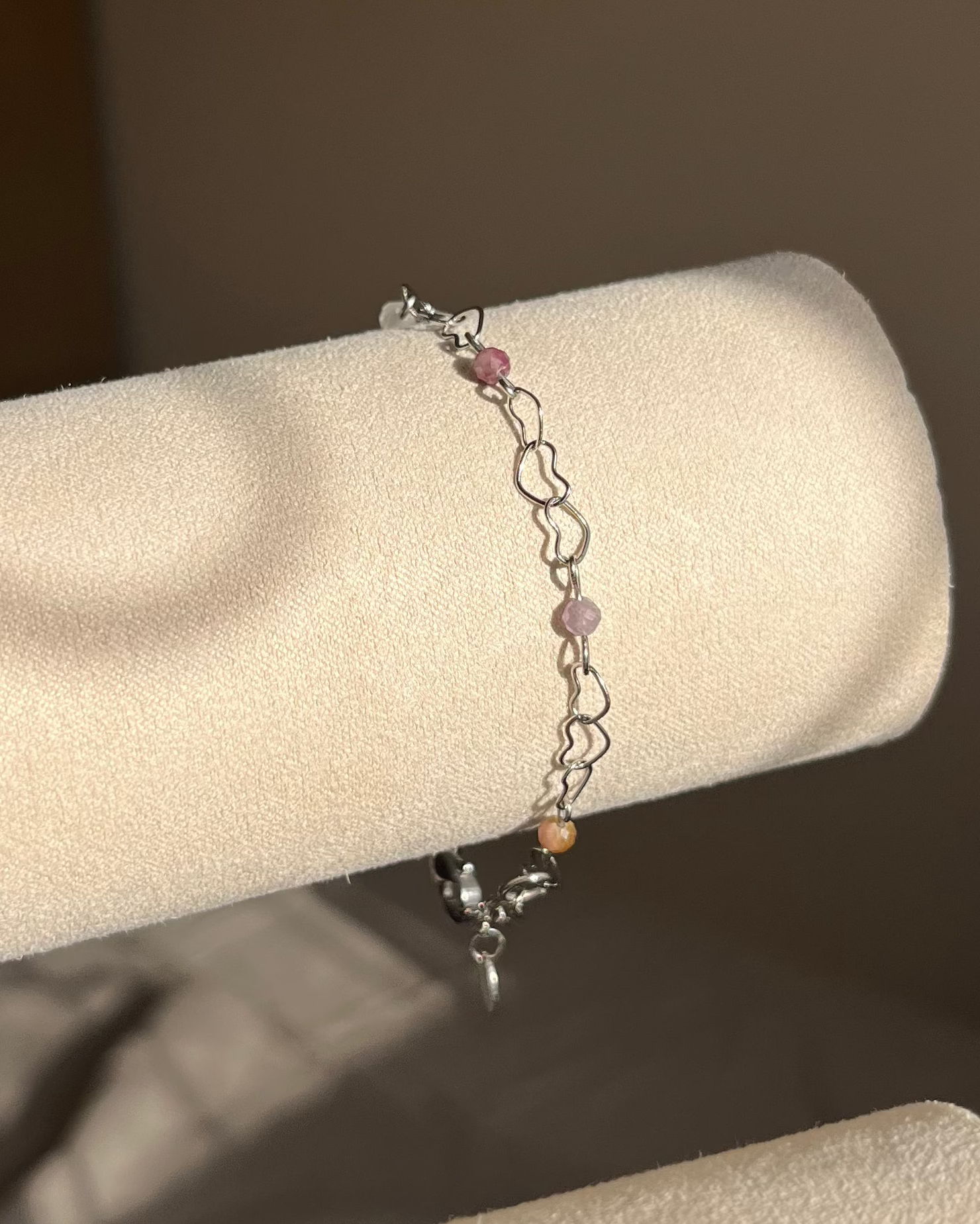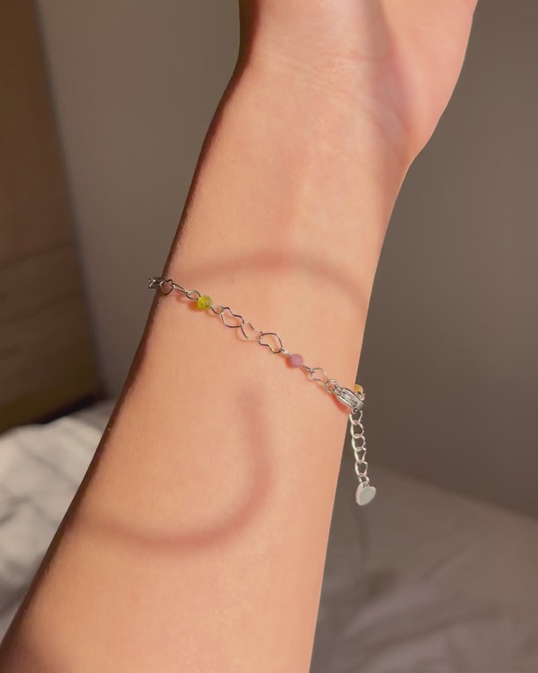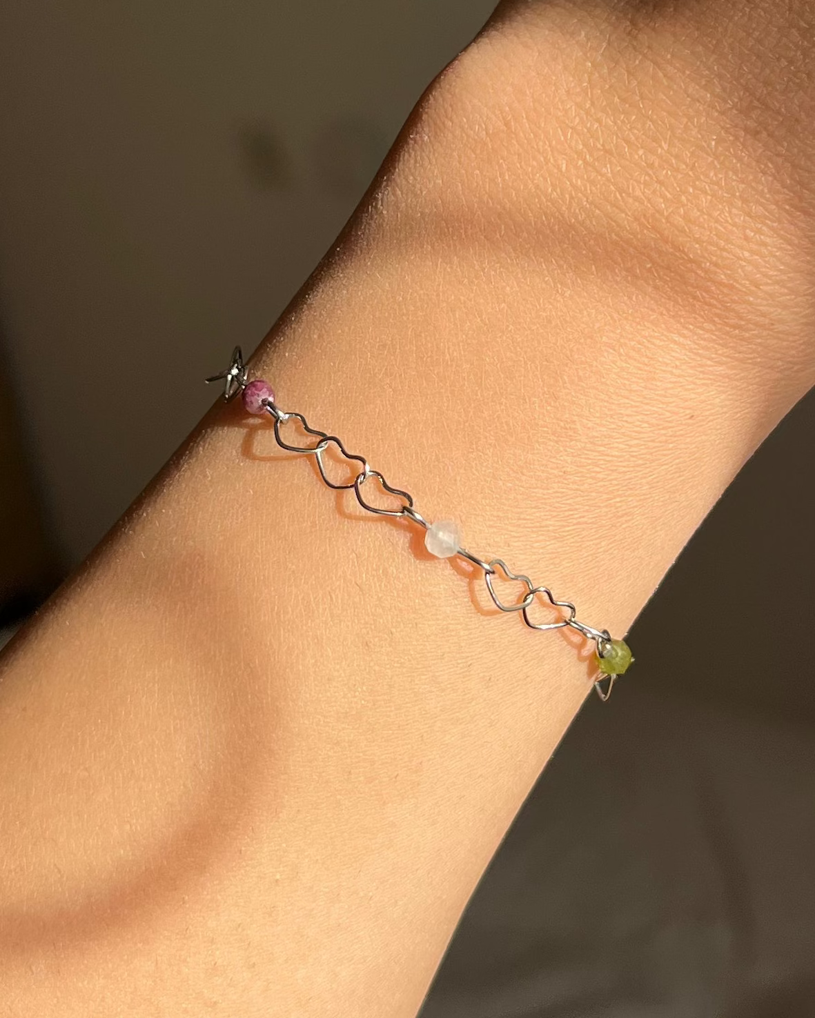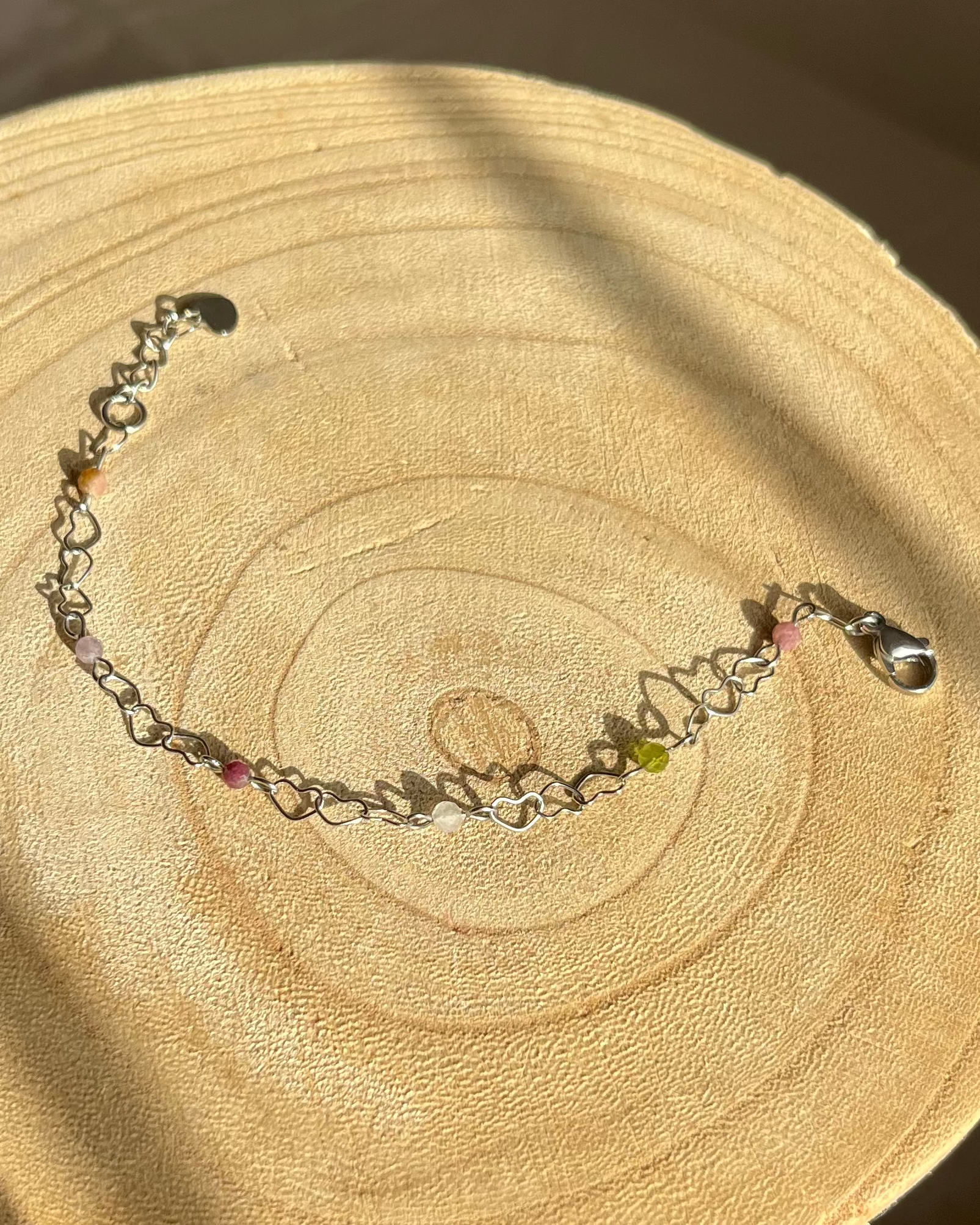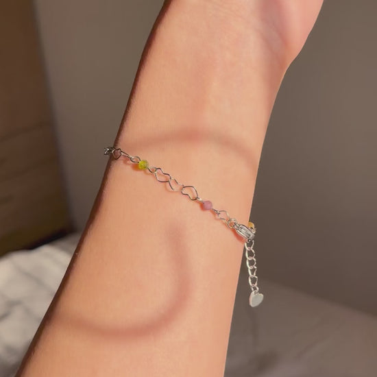 צמיד עדין ויפה עם חוליות בצורת לב בשילוב עם אבני טורמלין צבעוניות בליטוש פאסט